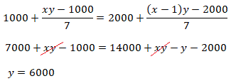 1000 + (x ⋅ y - 1000) : 7 = 2000 + [(x - 1) ⋅ y - 2000] : 7