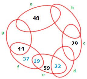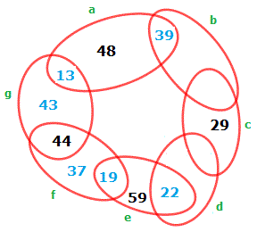 Nell'ellisse g c'è il numero 44 e quindi mancano due numeri aventi per somma 56 che sono 43 e 13. Nell'ellisse a