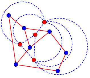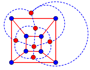 e uniamo due punti rossi con una linea tratteggiata blu se i due punti appartengono a due facce con uno spigolo in comune in modo che la linea blu attraversi solo quello spigolo. Se vi sono più spigoli comuni a due facce tracciamo una nuova linea blu per ciascuno di essi.