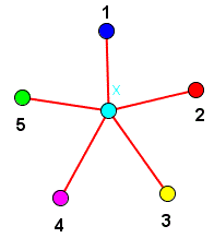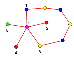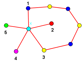 Nel 1890 Heawood riuscí a dimostrare che ogni grafo planare semplice è 5-colorabile mostrando che ogni insieme di 6 vertici può essere colorato con solo cinque colori. Vediamo il passo principale di questa dimostrazione. In un grafo planare semplice con n ≥ 6 vertici consideriamo un vertice X con grado cinque che avrà intorno a sè cinque vertici adiacenti che indichiamo con i numeri 1, 2, 3, 4, 5. Supponiamo che tutti i vertici adiacenti X abbiano colori diversi e quindi in questa situazione occorrono 6 colori distinti.![]()