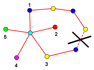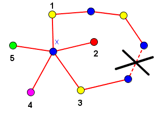 In questo caso essendo X collegato sia con il vertice 1 che con il vertice 3 il percorso P è chiuso e il vertice 2 è interno alla curva chiusa mentre il vertice 4 è esterno a tale curva. Non può esserci quindi nessun percorso che colleghi 2 con 4. Possiamo allora assegnare al vertice 4 lo stesso colore del vertice 2 e dare a X il colore del vertice 4 in questo modo vengono utilizzati solo 5 colori.