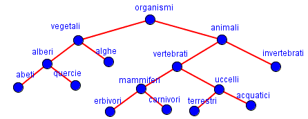 dove i vertici 5 e 3 avendo distanza 1 dal vertice 8 sono posti al livello 1, i vertici 7, 2, 1, 9 e 4 avendo distanza 2 dal vertice 8 sono posti al livello 2, i vertici 10 e 6 avendo distanza 3 dal vertice 8 sono posti al livello 3. Per i grafi ad albero radicato si utilizza la stessa terminologia degli alberi genealogici. Ad esempio, nel grafo precedente il vertice 8 è l'antenato dei restanti vertici ed è il padre dei vertici posti al livello 1 e quindi i vertici 5 e 3 sono i figli del vertice 8. Il vertice 5 è a sua volta il padre dei vertici 7, 2, 1 e quest'ultimi non hanno figli. Il vertice 3 è il padre dei vertici 9 e 4. Il vertice 9 è il padre dei vertici 10 e 6 che a loro volta non hanno figli. Un vertice senza figli è detto foglia. Questi tipi di grafi sono frequentemente utilizzati per rappresentare una classificazione di un insieme di elementi (piante, animali, libri, ecc.) secondo determinate caratteristiche comuni. Ecco ad esempio, una parziale classificazione degli organismi viventi.