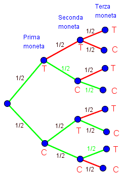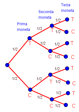 Come si vede dal grafo i casi possibili sono otto, cioè tutti i possibili cammini che congiungono la radice con le foglie, di questi solo tre casi (o cammini) sono favorevoli alla nostra condizione: due croce e una testa.