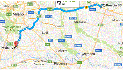 Se ci spostiamo con l'auto da una città a un'altra città di solito consultiamo una mappa stradale per conoscere il tragitto cioè, una possibile sequenza di strade e di paesi da percorrere. Ad esempio, se il viaggio è da Brescia a Pavia possiamo scegliere il percorso rappresentato nella seguente mappa stradale.
