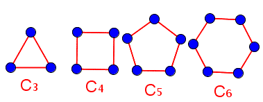 I poligoni sono esempi di grafi ciclici semplici; il triangolo è un grafo ciclico con 3 vertici, 3 spigoli e regolare di grado 2, un quadrilatero è un grafo ciclico con 4 vertici, 4 spigoli e regolare di grado 2. In generale un poligono di n lati è un grafo ciclico semplice con n vertici, n spigoli e regolare di grado 2 e si indica con Cn.