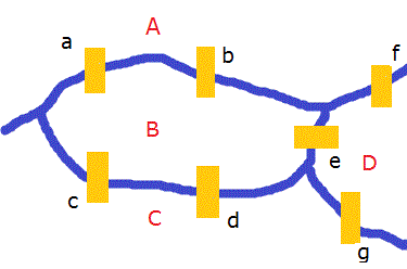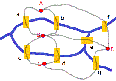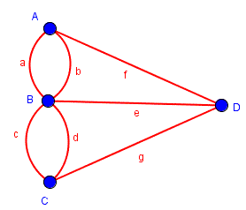 Un grafo è stato utilizzato per la prima volta, in modo consapevole, dal matematico svizzero Eulero (1707-1783) nel 1736 per risolvere un enigma noto come problema dei sette ponti di Konigberg. All'epoca di Eulero la città di Konigberg (l'attuale kalingrado) era divisa, dal fiume Pregel e dai suoi affluenti, in quattro zone collegate da sette ponti. In figura le quattro zone sono indicate con le lettere A, B, C, D e i sette ponti con le lettere a, b, c, d, e, f, g.