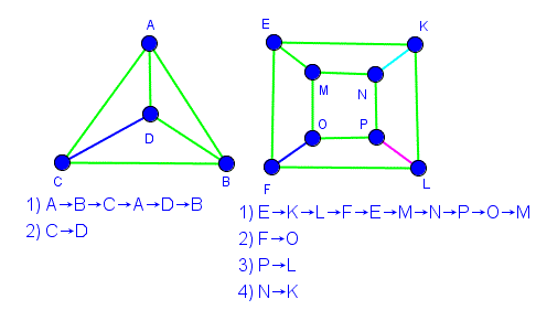 E se il grafo ha 2n vertici dispari (ricordiamoci che in un grafo il numero dei vertici dispari è sempre pari) qual è minimo numero di cammini necessari per attraversare tutti gli spigoli una e una sola volta? Ad esempio, in figura il primo grafo ha quattro spigoli dispari e il secondo grafo ha otto spigoli dispari; qual è il più piccolo numero di cammini che permette di attraversare ciascun grafo?