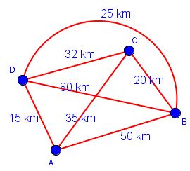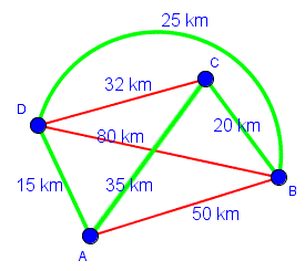 Qual è il percorso più breve? Il problema richiede quindi, di trovare un circuito hamiltoniano del grafo di peso minimo. Vediamo una possibile strategia. Il rappresentante partendo da A ha tre alternative: andare in B distante 50 km, andare in C distante 35 km, andare in D distante 15 km. Supponiamo che ogni volta che c'è una alternativa scelga sempre la città più vicina che non ha ancora visitato e quindi scelga di andare in D. Dalla città D ha di nuovo tre possibili scelte: andare in C che dista 32 km oppure andare in B con due strade alternative una di 80 km e l'altra di 25 km. Sceglie di andare in B percorrendo la strada più corta di 25 km. Ora, da B deve per forza andare in C percorrendo 20 km e poi tornare in A percorrendo 35 km.