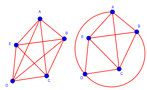 Come si può vedere il vertice C è all'interno della regione colorata mentre il vertice A è esterno a questa regione; ora, se vogliamo unire con uno spigolo il vertice A con il vertice C dobbiamo necessariamente intersecare la curva che delimita la regione colorata e quindi non è possibile deformare lo spigolo AC senza intersecare lo spigolo EB o lo spigolo BD o lo spigolo DE.