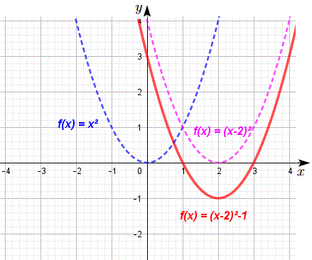 funzione traslata a destra di 2 unità e in basso di 1 unità: f(x) = (x - 2)2 - 1