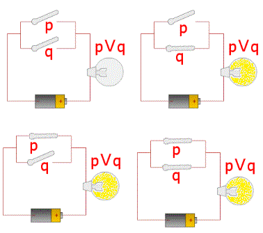 Il circuito elettrico con due interruttori p e q in parallelo, consente di simulare la disgiunzione logica. La lampadina si accende quando è chiuso almeno uno degli interruttori p e q.