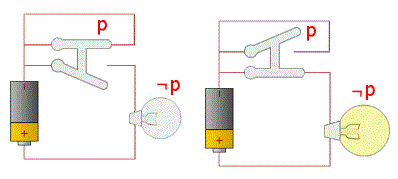 Il circuito elettrico con un interruttore p invertitore, consente di simulare la negazione logica. La lampadina si accende quando p è aperto.