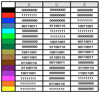 Il nostro occhio riesce a distinguere fino a 160 sfumature cromatiche per ciascuno dei tre colori primari e il più piccolo multiplo di 2 vicino a 160 è 28=256. Pertanto, nella codifica del colore, per ciascun colore primario sono previste 256 sfumature che vanno da 00000000 a 11111111. Questo significa che si possono codificare 23x8 = 16.777.216 colori distinti. Per ottenere un'immagine a colore (foto, dipindo, disegno) ad ogni pixel bisogna associare 3 byte: il primo per il colore rosso, il secondo per il colore verde e il terzo per il colore blu. Ecco ad esempio alcuni colori con la codifica RGB: