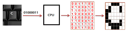 Quando premiamo un tasto sulla tastiera immediatamente la lettera che compare su questo tasto viene visualizzata sullo schermo: questa apparente semplice azione è il risultato di una sequenza di operazioni non semplici. Vediamole. Supponiamo di premere sulla tastiera il tasto della lettera C. I tasti sono degli interruttori normalmente aperti e quindi se non sono premuti non lasciano passare la corrente, quando premiamo il tasto C chiudiamo un dato circuito che corrisponde al codice binario 01000011 della lettera C e a tale codice è abbinato una determinata sequenza di segnali elettrici che viene inviata a una unità di elaborazione centrale detta CPU che a sua volta associa a tale sequenza il corrispondente codice binario dell'immagine della lettera C come si vede in figura.