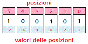 Il sistema di numerazione posizionale in base 2, detto anche sistema binario, utilizza solo due cifre: 0 e 1. Nella scrittura del numero binario, ogni posizione in un numero con più cifre, a partire da destra, corrisponde ad una potenza di 2 ci0è 1, 2, 4, 8, 16, 32, ... Ad esempio, il numero binario 100101: