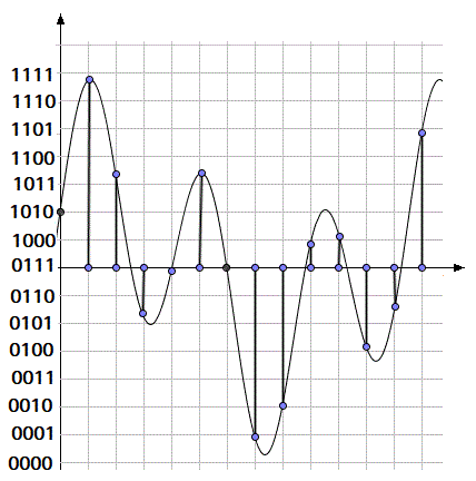 Il nostro orecchio riesce a percepire suoni che hanno frequenze comprese tra 20 Hz e 20.000 Hz (una frequenza di 20 Hz vuol dire che l'onda in ogni secondo compie 20 ascillazioni complete). La digitalizzazione dei suoni viene fatta sull'onda che genera il suono e questa procedura viene detta campionamento perchè a intervalli costanti di tempo si prelevano dei campioni dell'ampiezza dell'onda i cui valori vengono espressi in codice binario. Il numero degli intervalli costanti viene detto frequenza di campionamento. Per la voce telefonica viene utilizzata una frequenza di 8.000 campioni per secondo; per la musica fino a 44.100 campioni per secondo. I valori dell'ampiezza cioè i campioni sono memorizzati o in 8 o in 16 bit. Con 8 bit, il campione può assumere 256 possibili valori mentre con 16 bit i valori possibili sono 65536. Naturalmente maggiore è la frequenza di campionamento e il numero dei bit per memorizzare i valori delle ampiezze più lunga è la sequenza numerica della codifica e migliore è la qualità del suono perchè la ricostruzione dell'onda risulta più fedele a quella originale. Ecco ad esempio, come risulta un campionamento con frequenza di campionamento di 12 valori e campioni memorizzati con solo 4 bit.