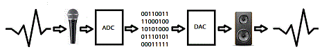 Un secondo di musica richiede 44.100 campioni di 16 bit (2 byte) quindi 88.200 byte e se la musica è stereo occorrono 88.200 byte per ciascuno dei due canali. In teoria la misurazione del suono richiede infiniti valori mentre la digitalizzazione del suono richiede solo un numero discreto di valori, nel primo casi si dice che la misurazione del suono è continua e si utilizza il termine misurazione analogica nel secondo caso si dice che è discontinua e si utilizza il termine misurazione digitale. Nel processo di digitalizzazione il microfono da una misura analogica del suono che invia a un convertitore analogico-digitale (ADC) che campiona l'onda a intervalli regolari e la trasforma in una sequenza di numeri binari. Nel processo di riproduzione del suono la sequenza dei numeri binari passa in un convertitore digitale-analogico (DAC) che riproduce l'onda sonora trasformandola in un'onda elettrica che invia ad un altoparlante che la converte in onda sonora.