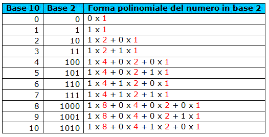 Nella tabella seguente sono riportati i numeri da 0 a 10 in base 2 con la relativa forma polinomiale.