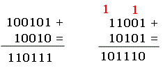 Vediamo due esempi di addizione tra numeri binari. Nella prima addizione la somma delle cifre non genera mai un riporto mentre nella seconda ci sono due riporti.