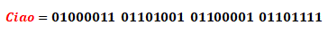 Ad esempio, alla lettera A corrisponde il numero decimale 65 e quindi il codice binario 01000001, alla lettera a corrisponde il numero decimale 97 e quindi il codice binario 01100001. La parola Ciao è composta da quattro caratteri e ad ogni carattere corrisponde un dato byte il quale a sua volta è costituito da 8 bit. Dalla tabella ASCII possiamo vedere che: