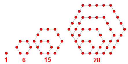 Un numero esagonale è un numero naturale che rappresentato mediante punti forma un esagono. Ad esempio, i primi quattro numeri esagonali sono 1, 6, 15, 28: