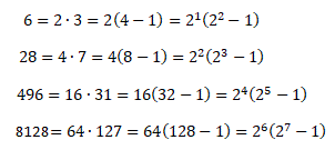 16 ha per divisori 1, 2, 4, 8, 16 e 1+2+4+8 = 15Euclide dimostrò una formula per ottenere i numeri perfetti. Osservando il seguente schema: