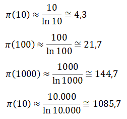 Π(10) = 4; Π(100) = 25; Π(1000) = 168; Π(10.000) = 1229