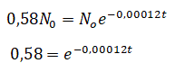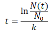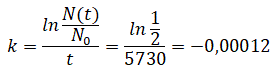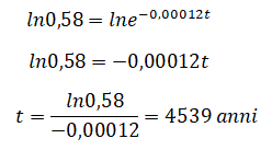 e determiniamo la costante k che dipende dal tempo di dimezzamento t=5730 anni e dal rapporto tra N(t) e N0 che è pari a 1/2.
