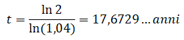 Possiamo determinare il tempo di raddoppiamento del capitale di 100 € impiegato al tasso composto del 4 per cento dove k = ln(1,04):