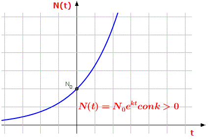 dove N(t) è la quantità all'istante t, N0 la quantità all'istante t=0, k è una costante che dipende dalla velocità di crescita o di decrescita (k è positivo nella crescita e negativo nella decrescita), t è l'intervallo di tempo della durata del fenomeno, e è il numero di Nepero. Il grafico della funzione N(t) = N0ekt con k>0 è tutto contenuto nel semipiano delle coordinate positive e mette in evidenza che al crescere dei valori della variabile t i corrispondenti valori di N(t) crescono molto rapidamente, inoltre il grafico passa per il punto (0, N0).
