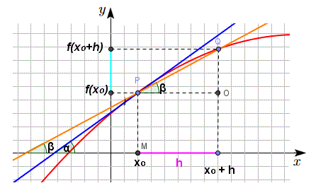 Ad esempio, supponiamo di voler determinare il coefficiente angolare della retta tangente alla curva y=f(x) in un suo punto P(x0, f(x0)). Tracciamo sia la tangente alla curva passante per P sia una retta secante alla curva passante per il punto P e per un punto Q della curva vicino a P con Q(x0+h, f(x0+h)).
