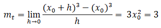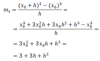 Vediamo così che quando h assume valori sempre più vicini a 0 sia a destra che a sinistra di x0 i corrispondenti valori di mt tendono al valore 3. Questo fatto ci induce a dire che mt=3 rappresenta la migliore approssimazione del coefficiente angolare della retta tangente alla curva f(x)=x3 nel punto di ascissa x0=1 oppure che mt=3 rappresenta il valore del limite quando h tende a zero e scriveremo: