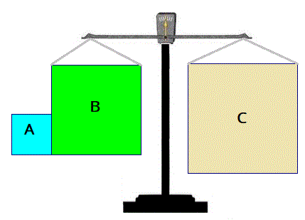 Ritagliamo i tre quadrati e mettiamo su una bilancia a due bracci a sinistra i due quadrati dei cateti e a destra il quadrato dell'ipotenusa. Che cosa osserviamo?