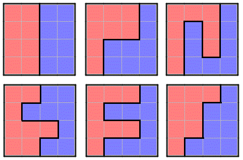 Ci sono 6 modi per dividere un quadrato 4 per 4 in 2 parti congruenti.