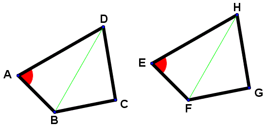 I triangoli ABD e EFH sono congruenti per il primo criterio di congruenza dei triangoli, ne segue che le diagonali BD e FH sono congruenti e quindi i triangoli BCD e FGH sono congruenti per il terzo criterio di congruenza dei triangoli.