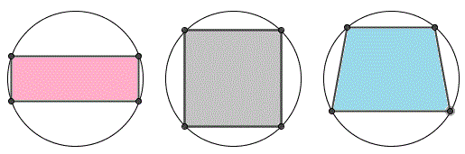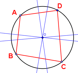 Un quadrilatero è inscritto in una circonferenza se tutti i suoi vertici appartengono alla circonferenza; equivalentemente la circonferenza è circoscritta al quadrilatero. Quali quadrilateri sono inscrivibili in una circonferenza? Se un quadrilatero è inscritto in una circonferenza allora necessariamente i suoi lati sono corde della circonferenza e quindi gli assi dei suoi lati passano tutti per il centro della circonferenza.