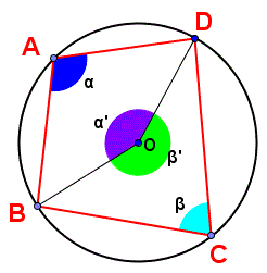 Infatti, i due angoli opposti α e β sono due angoli alla circonferenza che insistono rispettivamente sull'arco BCD e BAD. Inoltre, sono rispettivamente uguali alla metà degli angoli al centro α' e β' e poichè la somma di questi due angoli al centro è di 360° ne segue che la somma di α e β è di 180°. Analogamente anche la somma degli altri due angoli opposti del quadrilatero è 180° essendo la somma degli angoli interni di un quadrilatero 360°. Pertanto: