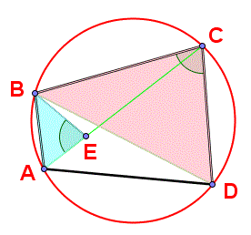 Gli angoli in C e in D sono congruenti perchè insistono sullo stesso arco AB, gli angoli in A e in E sono congruenti perchè sono entrambi supplementari all'angolo BCD. Possiamo quindi scrivere la proporzione: