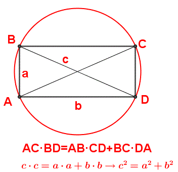 Se applichiamo il teorema di Tolomeo a un rettangolo ciclico si perviene al teorema di Pitagora:
