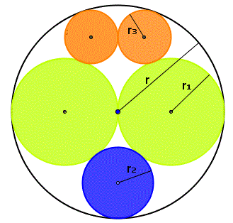 Quesito n° 33: In una circonferenza di raggio r sono tracciate due circonferenze di raggio r1, una circonferenza di raggio r2 e due circonferenze di raggio r3 e tutte le circonferenze sono a due a due tangenti. Che relazione c'è tra r e r1, tra r e r2, tra r e r3?