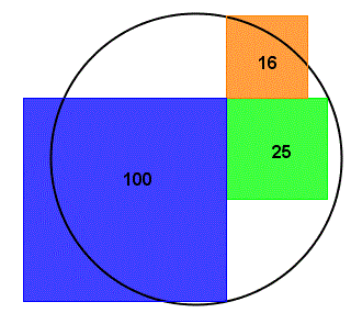 Quesito n° 34: Qual è il raggio della circonferenza se le aree dei quadrati sono rispettivamente 100, 25 e 16?