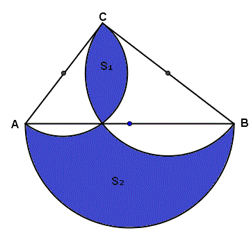 Quesito n° 36: Che relazione c'è tra la superficie S del triangolo rettangolo ABC e le superficie delle regioni colorate S1 e S2?