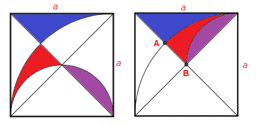 colorata in viola possiamo facilmente notare che le tre superficie colorate sono equivalenti a un quarto di quadrato.