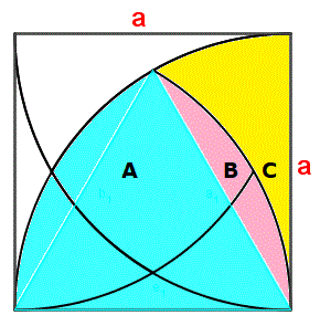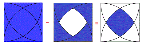 La strategia è quella di togliere dall'area di tutto il quadrato di lato a quattro regioni congruenti come si vede in figura: