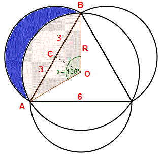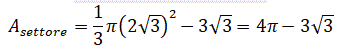 L'area del segmento circolare si ottiene togliendo dal settore circolare con un angolo di 120° e raggio R il triangolo AOB.