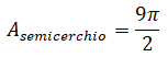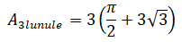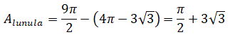 L'area di una sola lunula si ottiene togliendo dal semicerchio di raggio 3 il segmento circolare che ha per corda il lato del