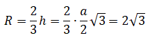 Il raggio R è uguale ai 2/3 dell'altezza del triangolo equilatero e l'altezza del triangolo è uguale alla metà del