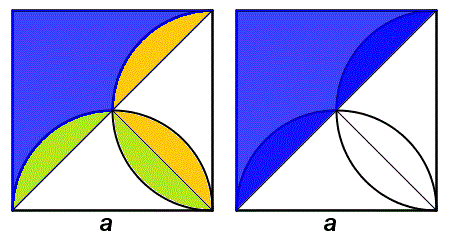 Tracciamo una diagonale e una semidiagonale del quadrato e coloriamo le parti conguenti con lo stesso colore come si vede in figura. Come si vede la parte colorata del quesito è equivalente alla metà del quadrato di lato a e quindi la sua area è: