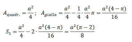ogni parte colorata in giallo si ottiene togliendo dall'area del quadrato di lato a/2 l'area di un quarto di cerchio di raggio a/2.