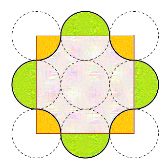 Il quadrato che ha vertici nei centri dei cerchi estremi ha lato 4: Dalla figura si nota che l'area della croce curvilinea si ottiene aggiungendo all'area del quadrato l'area di un cerchio di raggio 1.